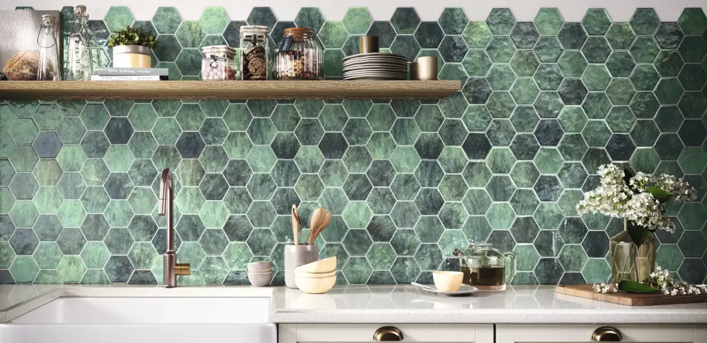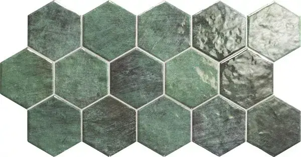 Hatszögletű formák fényes színvilággal és rusztikus beütésekkel. Ideális konyhák, fürdőszobák és belső terek burkolására. A smaragd zöld és a tenger kék kellemes és finom hangulatot varázsol a környezetben.